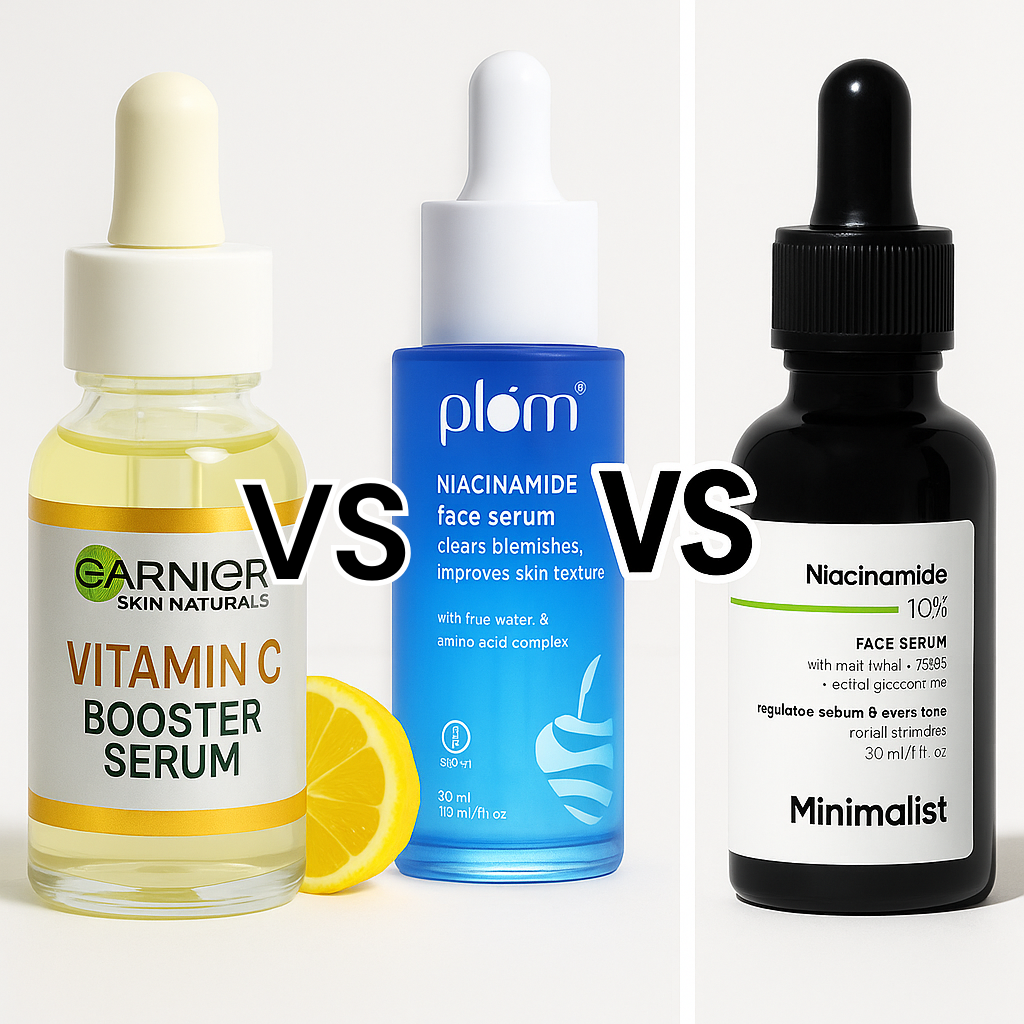 If you’re searching for a perfect face serum to target dullness, acne marks, and uneven skin tone — you’re in the right place! Today, we’re comparing three of India’s most-loved serums — Garnier Vitamin C Booster Serum, Plum Niacinamide Serum (10%), and Minimalist Niacinamide Serum (10%).