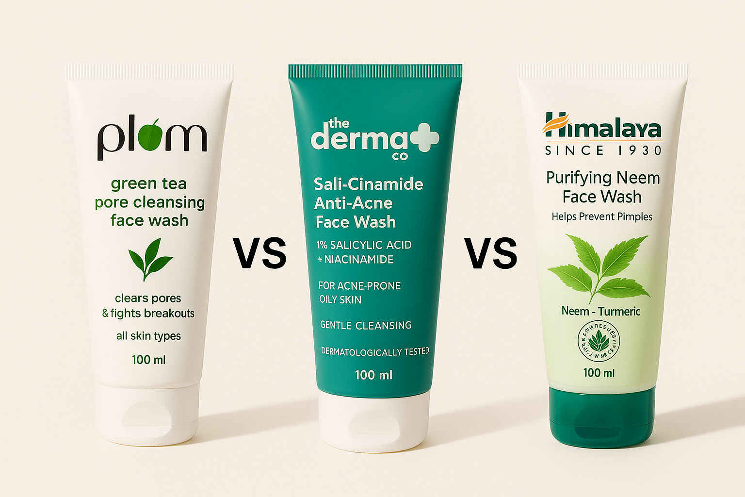 If you’re confused about which face wash is best for your skin type, this detailed comparison will make your choice simple! We’ve compared three of India’s most popular and dermatologist-approved cleansers — Plum Green Tea Face Wash, The Derma Co 1% Salicylic Acid Face Wash, and Himalaya Purifying Neem Face Wash.